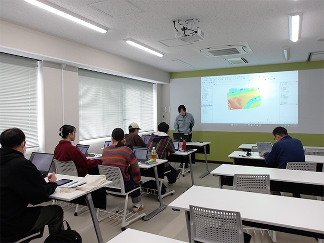 インフラDX人材育成教育のひとつとして、3次元計測ができる測量機器の操作や、3次元モデルデータの解析、図化など実際に体験してもらいました。